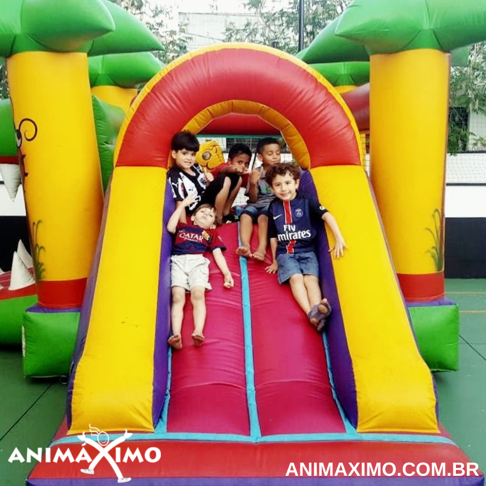 Esse é o brinquedo mais versátil do nosso portfólio. Cheio de atrativos, pode ser um pula-pula, possui uma girafinha que serve de joão-bobo e uma escalada com um mini tobogã. Uma ótima opção de brinquedo completo e que ocupa pouco espaço e que pode ser utilizado em áreas de piscina.