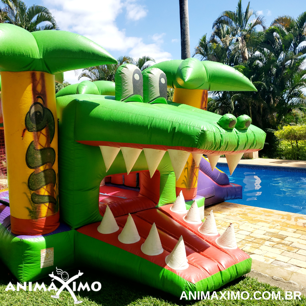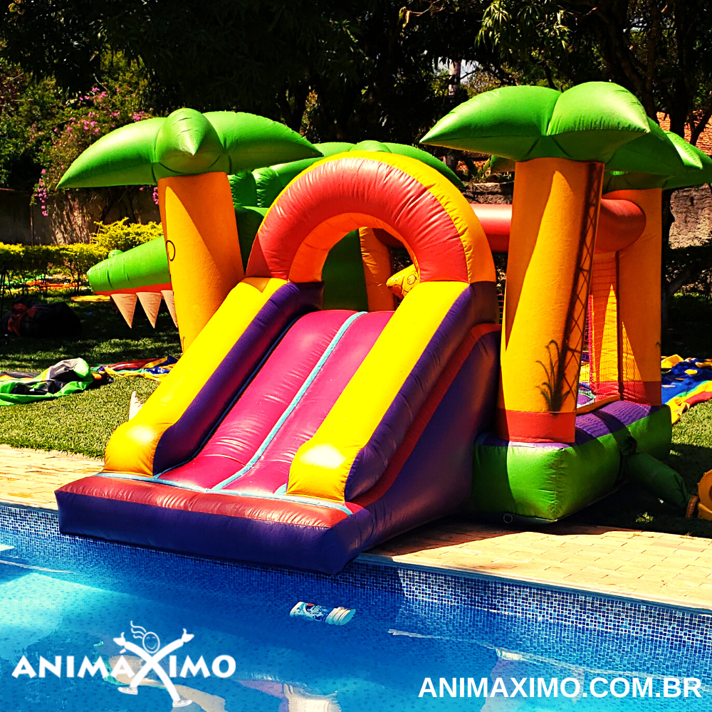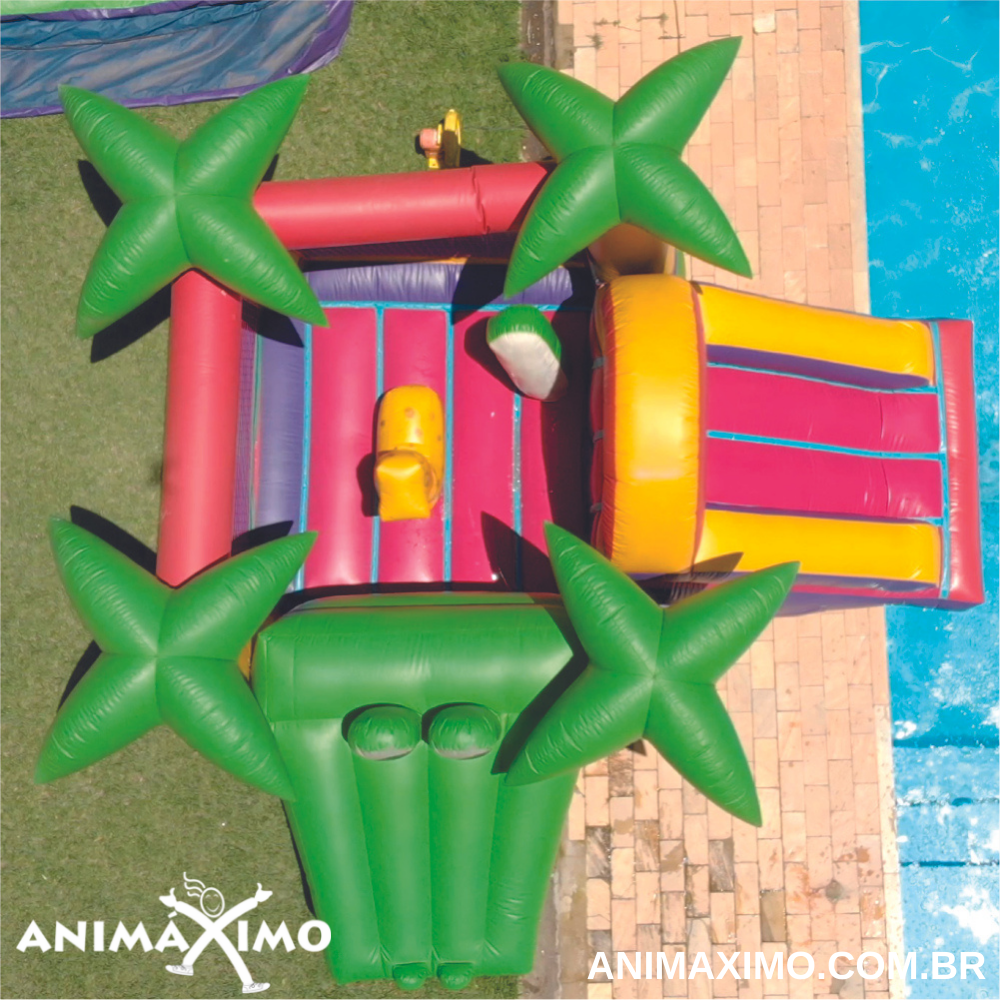 Esse é o brinquedo mais versátil do nosso portfólio. Cheio de atrativos, pode ser um pula-pula, possui uma girafinha que serve de joão-bobo e uma escalada com um mini tobogã. Uma ótima opção de brinquedo completo e que ocupa pouco espaço e que pode ser utilizado em áreas de piscina.
